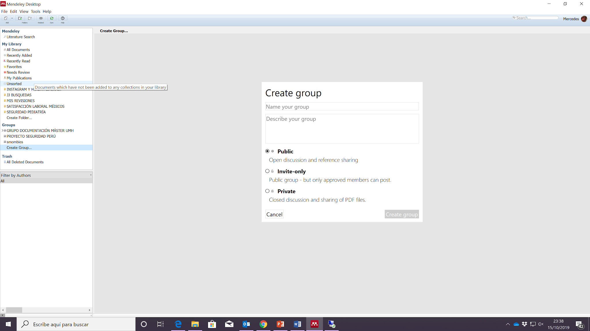 Pese a que se nos da la opción de compartir en diferentes modalidades de grupo, Mendeley actualmente solo admite grupos privados.