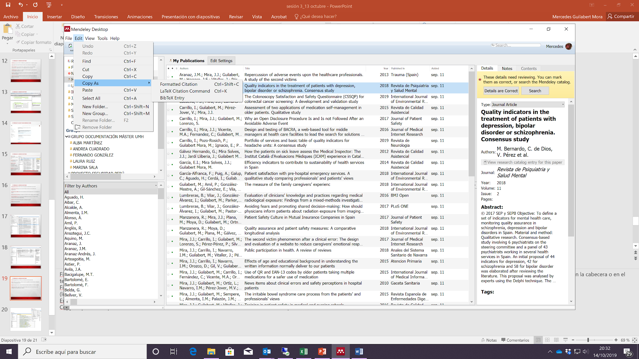 Needs reviews: cuando una referencia está incompleta Mendeley automáticamente crea una carpeta con estas referencias que necesitan revisarse. Esta carpeta también aparecerá en la versión web. También manualmente podemos marcar una referencia con botón derecho del ratón como que necesita revisarse. Al mostrarnos el listado de documentos con posibles conflictos nos permite su edición y queden subsanados los posibles errores.