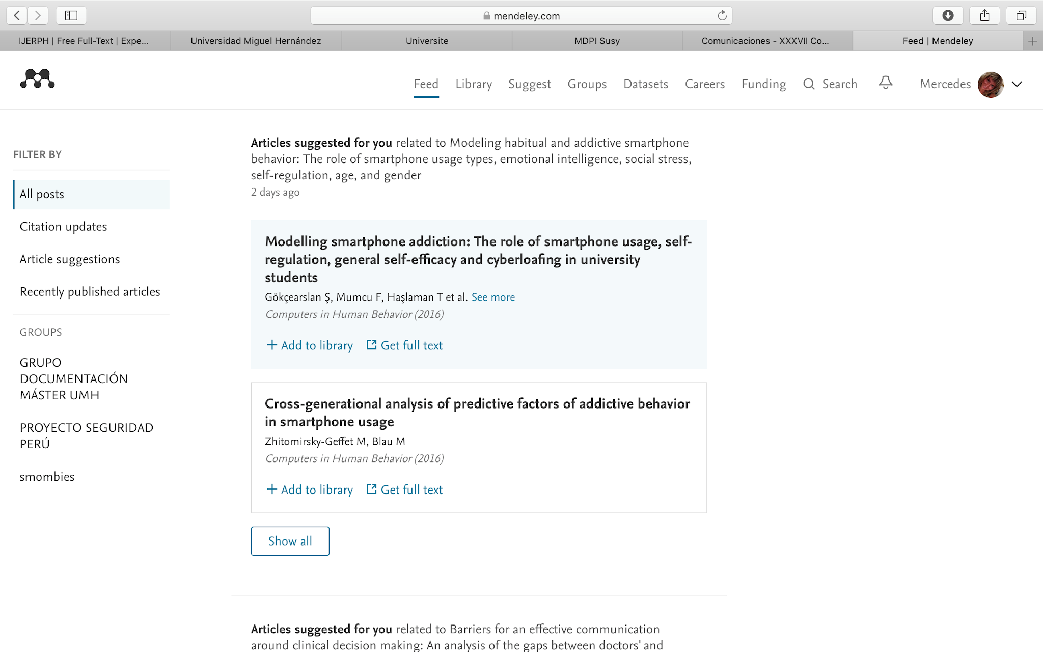 Mendeley suggest: ejemplo de cómo Mendeley trabaja como plataforma de descubrimiento y te sugiere documentos que pueden interesarte de acuerdo a tu experiencia con Mendeley search. Las referencias obtenidas pueden incorporarse fácilmente a nuestra base de datos.
