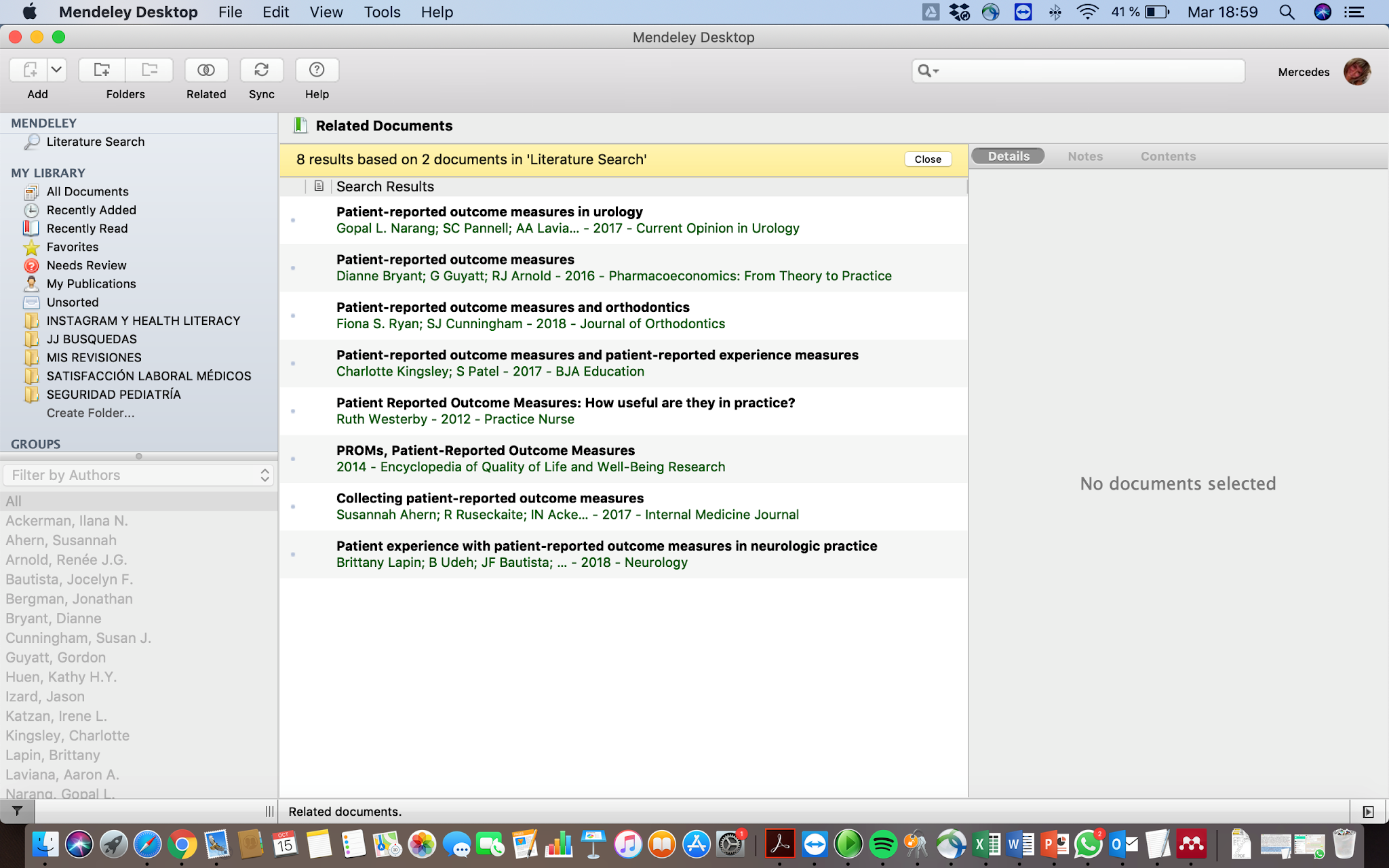 Hay un tercer método de incorporación de referencias: picando un registro o una selección de ellos en la columna central y el icono Related, o el botón derecho del ratón y seleccionando Related. El sistema efectúa una búsqueda en la base de datos Mendeley y nos muestra registros encontrados con la palabra resaltada:
