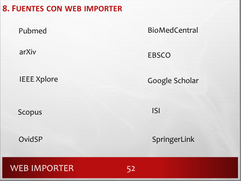 La mayoría de fuentes de información funcionan con Web importer: PubMed, BioMed Central, arXiv, EBSCO, IEEE Xplore, Google Scholar, SCOPUS, ISI, OvidSP, Springer Link.