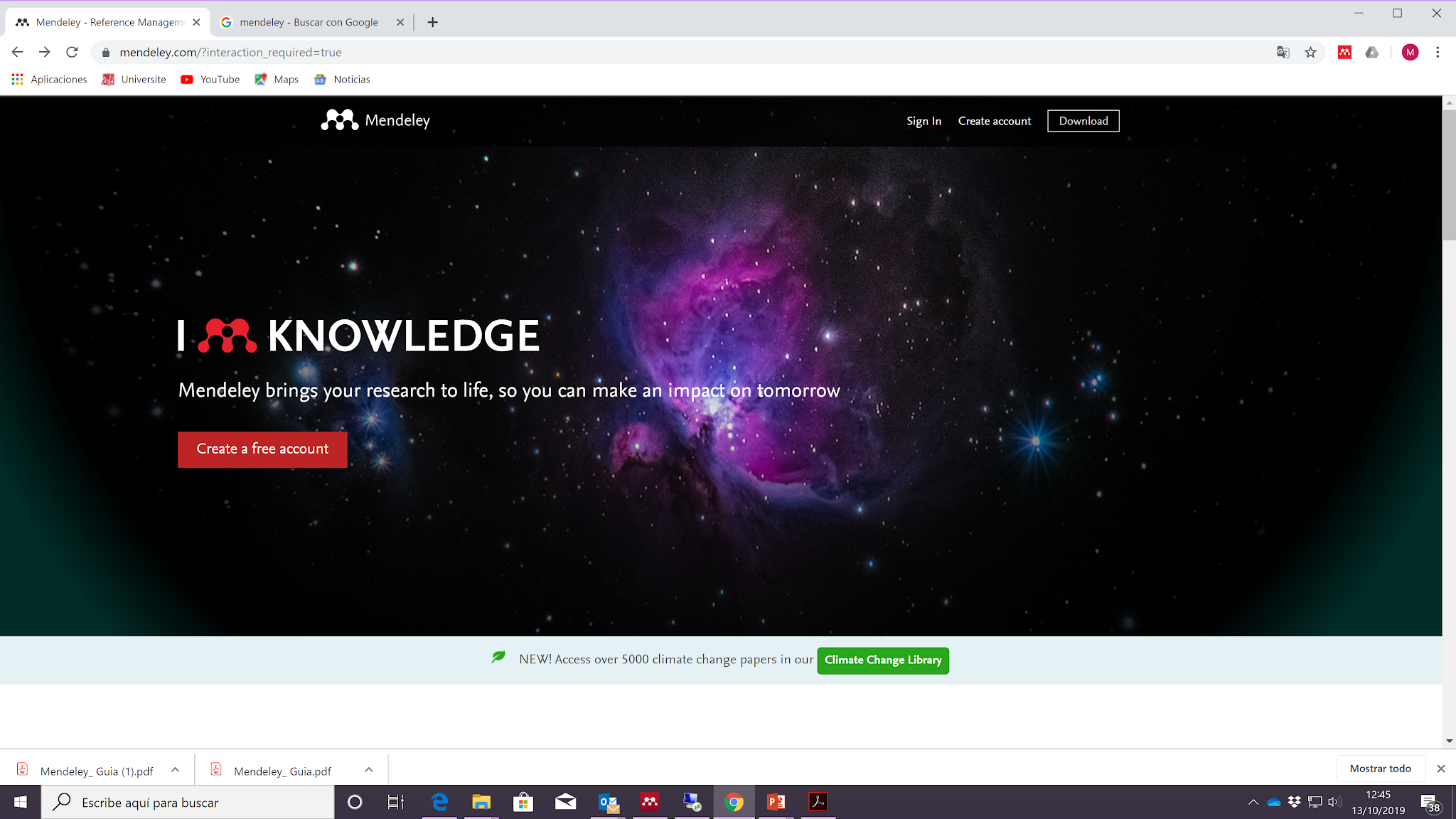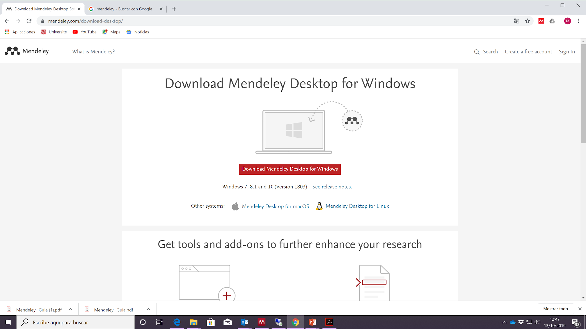 Accedemos a la página de Mendeley y creamos una cuenta con nuestra dirección de correo institucional, cumplimentamos los datos requeridos y descargamos en instalamos Mendeley versión escritorio.